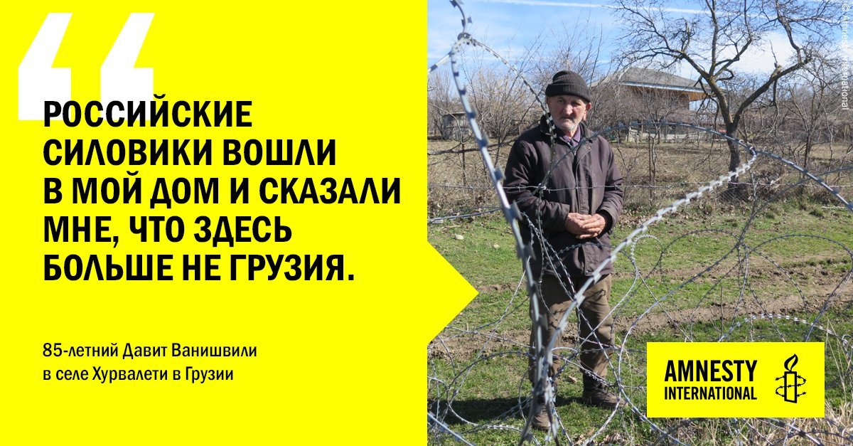 «Российские пограничники вошли в мой дом и сказали мне, что здесь больше не Грузия. В тот же день они начали устанавливать заграждения вокруг моего дома. У меня больше нет доступа ни к остальной части села, ни к остальной части страны», — сказал он Amnesty International. «Бордеризация» АЛР затронула все этнические сообщества по обе стороны линии разделения.