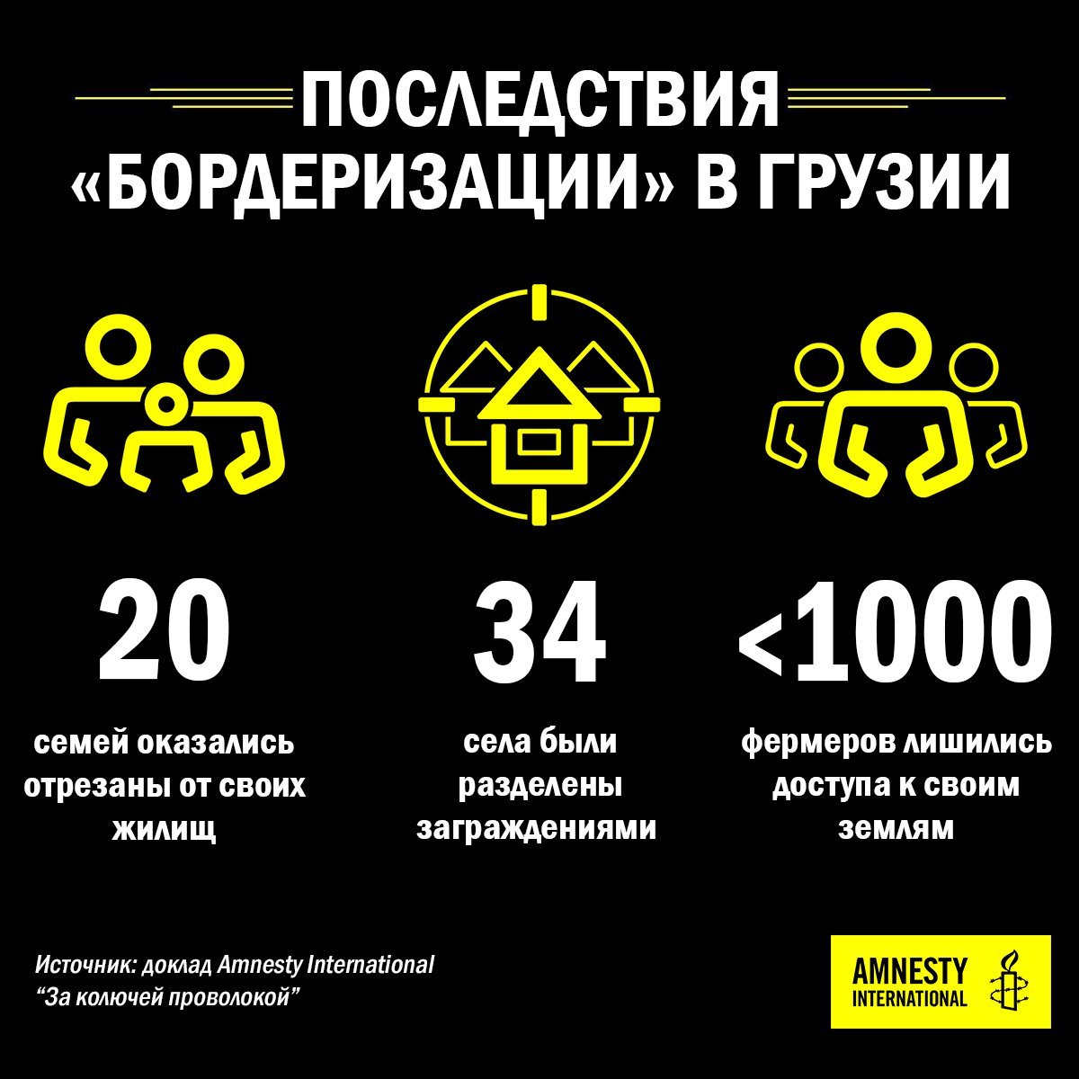 В докладе «За колючей проволокой: Нарушения прав человека в результате «бордеризации» в Грузии» раскрываются разрушительные последствия действий России и фактических властей Абхазии и Южной Осетии/Цхинвальского региона, направленных на оборудование «государственной границы» на всём протяжении спорной разграничительной линии путём установки заграждений из колючей проволоки, заборов, рвов и прочих физических преград, которые разделили деревни и отрезали местных жителей от их сельскохозяйственных угодий, источников воды, мест отправления религиозных обрядов и даже от их семейных кладбищ.